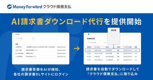 株式会社マネーフォワードは、『マネーフォワード クラウド債務支払』において、一部ユーザーを対象に「AI請求書ダウンロード代行」の提供を開始します。各社請求書DLサイトをAIエージェントが自律的に操作し、請求書の取り込みから支払い依頼作成までを行うことで、請求書受領業務を大幅に効率化できます。