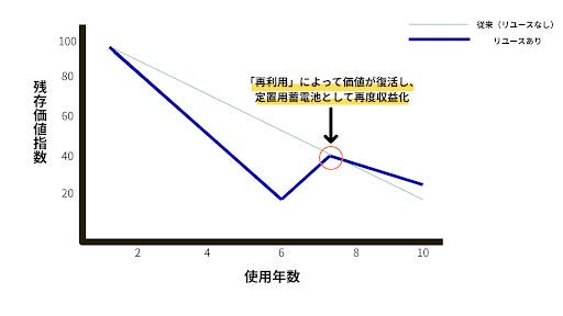 EVで寿命を終えそうなバッテリーも、定置用に再利用すれば価値を延ばすことができます。これによりEVの残存価値向上、EV導入コストの実質的な低減、定置蓄電池の普及加速、脱炭素と資源循環の同時達成が期待されます。