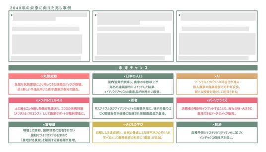 さらに、一部テーマの統合や名称変更を行った上で、気候変動を含む複数の要因によるコメや野菜の価格高騰などを背景に、世の中の関心が高まっている「農業」をはじめとして、未来のビジネスを考える際に重要と捉えた5テーマ(「農業」「つながり」「推し活」「資産」「情報流通」)を新たに追加しています。