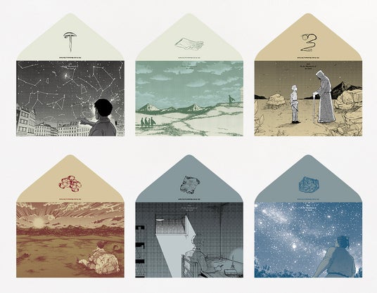 シールのデザインはシークレット1種を含む、全8種類。B6判の『チ。-地球の運動について-』コミックスの2冊分のサイズに、テーマ別に厳選された絵柄がスタイリッシュにデザインされています。専用の封筒(全6種類)に、全8種のシールがランダムに封入された状態で販売いたします。また、今回1ケース50枚中、2枚に「当たり!」として、作中に登場するあるアイテムのレプリカがシールの間に封入されています。選んで楽しい、眺めて楽しい、貼っても楽しいシールくじびきを、ぜひお楽しみください!