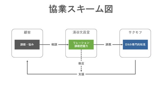サクモフが、業務の効率化や社内アプリ開発、ITツールの導入、補助金活用など、専門的な観点から顧客を直接支援します。さらに、湯谷文昌堂の現場に根差したアドバイスが加わることで、より質の高い、実践的な課題解決を実現します。