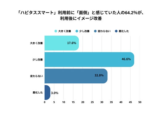 「ハピタススマート」利用前に「ポイ活は面倒だ」と感じていたユーザー466名に利用後の印象を尋ねたところ、「大きく改善」(17.6%)、「少し改善」(46.6%)と、64.2%が「印象が改善した」と回答しました。