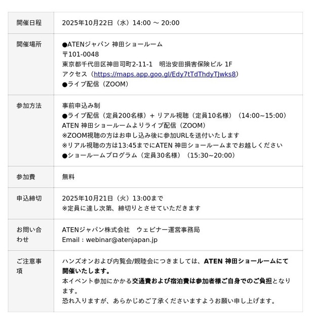 さらに、ATEN 神田ショールームにてハンズオン形式の体験会を行い、その後は軽食・ドリンクを片手に気軽にお客様のギモンを解消できる内覧会・懇親会もご用意。