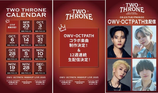 OWV・OCTPATHが、12月13日(土)・14日(日)に神奈川・横浜BUNTAIで開催する史上初の連動型2DAYSワンマンライブ『TWO THRONE』に向けて、本日Instagram・TikTok・YouTubeにて全員で生配信を実施。合同ライブ実施の1週間前まで毎週1回・全12回にわたってOWV・OCTPATHのメンバーがランダムの組み合わせで生配信を実施することを発表しました。