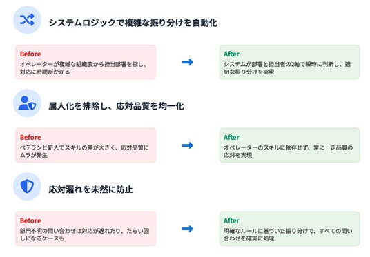 - 複雑な振り分けの自動化:部署と担当者情報を基にシステムが瞬時に判断し、応対漏れゼロを実現