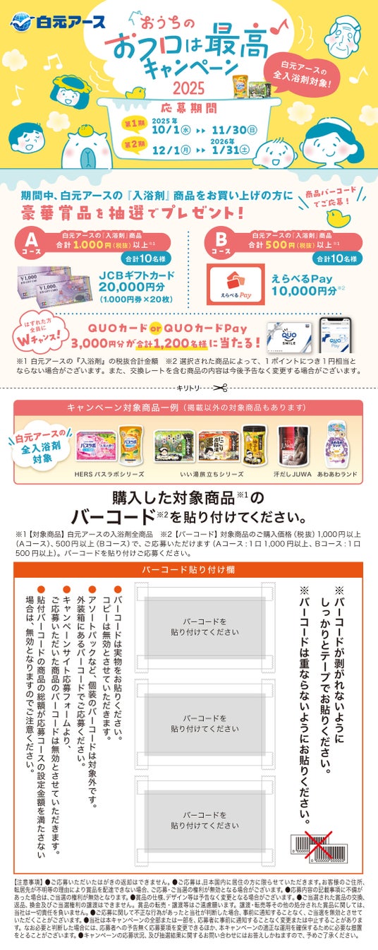 キャンペーン期間中に白元アースの「入浴剤」の全商品の中から税抜き1,000円以上(Aコース)または税抜き500円以上(Bコース)をご購入いただき、商品のバーコードを専用の応募はがき、または郵便はがきに貼付し応募、もしくは購入時のレシートを使用してキャンペーンWEBサイトの専用応募フォーム(※2025年10月1日(水)公開予定)から応募して下さい。