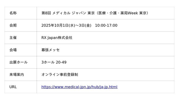 株式会社Berry(本社:東京都台東区、代表取締役:中野裕士)は2025年10月1日(水)~3日(金) に幕張メッセで開催される、病院・クリニック・薬局・介護分野の総合展「メディカル ジャパン 東京」に出展いたします。