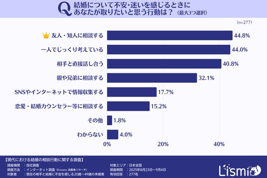 結婚に不安や迷いを抱える人たちは、その不安を感じた際にどのような行動を取りたいと思うのでしょうか。この点について質問したところ、パートナー本人と直接向き合うよりも先に、友人への相談や自分自身で考えることを選択する傾向が見られました。
