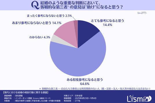 相談相手に「客観性」を求める声が強いことがわかりましたが、親や友人のような身近な人ではなく、利害関係のない第三者の意見についてはどのように考えているのでしょうか。結婚のような重要な決断において、そうした第三者の意見が助けになると思うかを質問したところ、多くの人がその価値を認識していることがわかりました。
