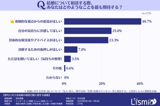 結婚という人生の重大な局面において、当事者同士では見えにくい視点や、感情に左右されない冷静な判断を、多くの人が求めていることがうかがえます。身近な人からの共感やアドバイスも大切ですが、それとは別に、完全に中立的な立場からの意見に対しても高い期待を寄せているようです。客観的な判断材料への潜在的なニーズの高さを示す、興味深い結果と言えるでしょう。