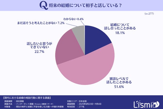 グラフを見ると、「結婚について話し合ったことがある」と答えた人は18.1%にとどまりました。一方で、最も多かったのは「雑談レベルで話したことがある」で51.6%、さらに「話したいと思うが、できていない」と回答した人も22.7%にのぼります。