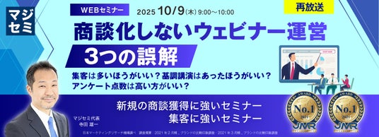 本セミナーでは、年間1,200回以上のウェビナーを支援するマジセミ代表・寺田が、成果に直結するウェビナー運営の本質を明らかにします。「多ければ良い」という量の追求ではなく、どのように質の高いリードを獲得し、商談へとつなげるか。そのために避けるべき“誤解”と、取り入れるべき“運用設計”を具体的に解説します。すでにウェビナーを実施している方はもちろん、これから活用を検討している方にも有益な内容です。