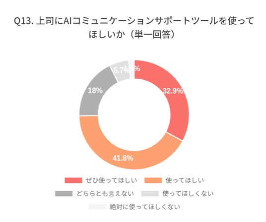 Z世代の約4人に3人(74.7%)が、上司がAIによる「やる気を引き出す言葉遣い」の提案機能を使うことを期待している。「ぜひ使ってほしい」と強く望む層が32.9%存在し、単なる関心に留まらない切実なニーズが浮き彫りに。