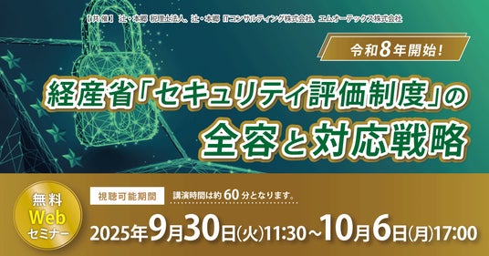 辻・本郷 ITコンサルティング株式会社(本社:東京都渋谷区、代表取締役社長:黒仁田健)は、辻・本郷 税理士法人(本社:東京都新宿区、理事長:桑木小恵子)と、エムオーテックス株式会社(本社:大阪府大阪市、代表取締役社長:徳毛博幸)と共催で、2025年9月30日(火)に「令和8年開始! 経産省「セキュリティ評価制度」の全容と対応戦略」セミナーを開催いたします。