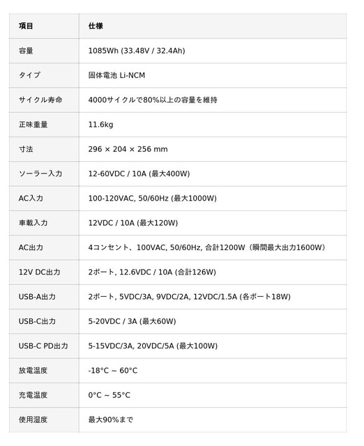 - 極限環境下での安定動作: 従来のポータブル電源が苦手としてきた-20℃の極低温から60℃の高温まで、幅広い温度環境で安定した性能を発揮。これにより、寒冷地での災害時や炎天下での保管など、過酷な状況下でも確実に電力を供給できます。