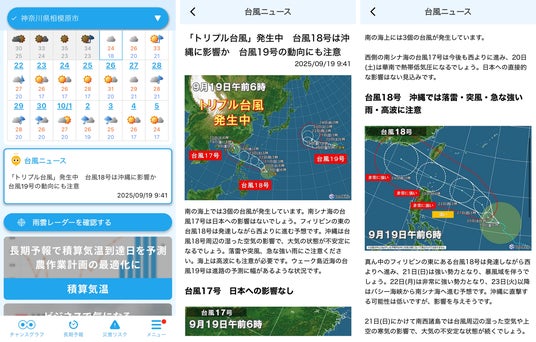 このたび気象情報アプリに新たに「台風ニュース」を追加しました。台風“発生”の時点で、進路や影響度合いなどの予測と解説を提供する機能です。いよいよ本格的な台風シーズンが到来します。栽培や農業経営の行動計画にお役立てください。