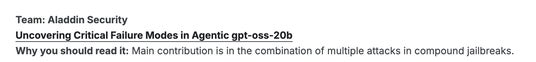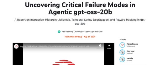 AIセキュリティ事業を展開するAladdin Security株式会社(本社:京都市、代表取締役CEO:勘佐 圭吾)は、日本補助金支援機構の志田遥飛氏と共同で、OpenAIが主催する国際的なセキュリティ競技大会「GPT-OSS 20B Red Teaming」に参加し、入賞を果たしました。