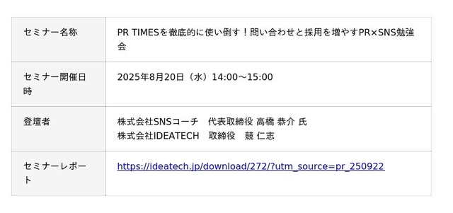 コンテンツPR・コンテンツマーケティング・コンテンツセールスを総合支援する株式会社IDEATECH(本社:東京都港区、代表取締役社長:石川友夫)と、株式会社給与アップ研究所(本社:東京都千代田区、代表取締役:高橋恭介)のグループ会社である株式会社SNSコーチは、2025年8月20日に共催セミナー「PR TIMESを徹底的に使い倒す!問い合わせと採用を増やすPR×SNS勉強会」を開催しました。