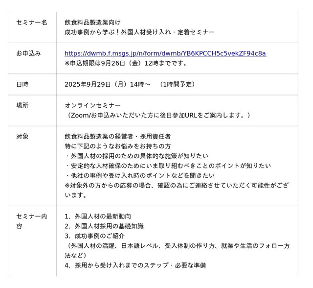 パーソルグループで外国人材に特化した人材サービスを提供するPERSOL Global Workforce(パーソル グローバルワークフォース)株式会社(本社:東京都港区、代表取締役社長:多田 盛弘)は、2025年9月29日(月)に飲食料品製造業向けの外国人材受け入れ・定着に関するオンラインセミナーを開催します。外国人材の採用に興味はあるが、ノウハウ不足や漠然とした不安で悩んでいる方、すでに採用経験はあるものの定着に課題を感じているご担当者さまは、ぜひご参加ください。