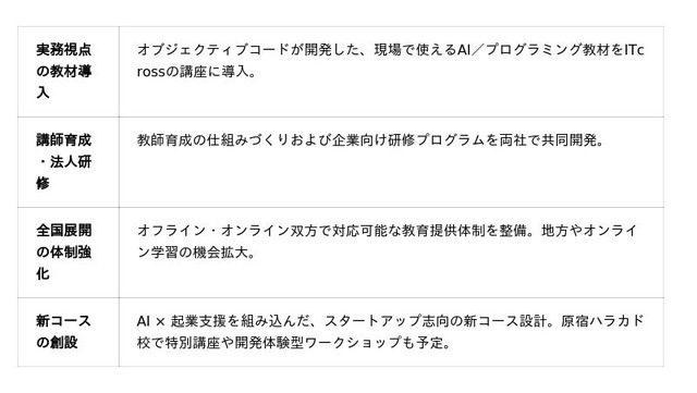 2025年9月29日、IT開発・AIコンサルティングを手掛ける株式会社オブジェクティブコード(東京都港区、代表取締役:溝口勇樹)は、AI教育・起業支援を手掛けるITcross株式会社(東京都渋谷区、代表取締役:菅井朝日)と、戦略提携を締結しました。これにより、より実践的で現場直結型のカリキュラムを含む教育プログラムを全国で展開し、AIリテラシーの底上げと起業支援の強化を図ります。教育の質を高めたいすべての人に、新たな学びの場を提供します。