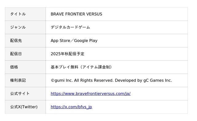 株式会社gumi(本社:東京都新宿区、代表取締役社長:川本 寛之)は、全世界累計3,800万ダウンロードを突破したスマートフォン向け本格RPG『ブレイブ フロンティア』シリーズの最新作となるアプリゲーム『BRAVE FRONTIER VERSUS』の事前登録を開始したことを発表いたします。