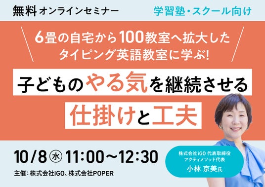 このたび、教育DXサービス「Comiru」を提供する株式会社POPER(本社:東京都中央区、代表取締役:栗原慎吾)と、英語タイピング学習プログラム「アクティメソッド」「英語王」を展開する株式会社iGO(本社:東京都渋谷区、代表取締役:小林京美)は、学習塾経営者・教育関係者向けに無料オンラインセミナーを開催します。