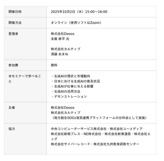 企業版ふるさと納税を活用した地域課題解決プラットフォーム「river(リバー)」を運営する株式会社カルティブ(本社:神奈川県横浜市、代表取締役:池田 清)は「地域課題解決シリーズセミナー」として、2025年10月2日(木)に自治体と企業が共に歩むAI時代の地域づくりについて、今、自治体が取り組むべき戦略と具体的な活用方法を解説するセミナーを開催します。