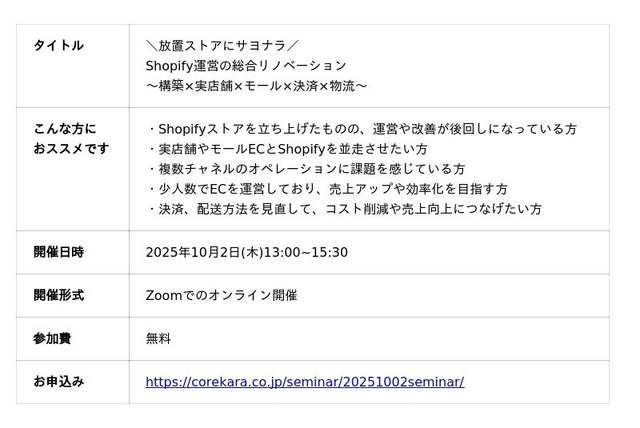 この問題を解決すべく、累計2万件以上のECサイト支援実績を持つ株式会社これから(本社:東京都新宿区、代表取締役:今泉 雄介)は、STORES株式会社、テープス株式会社、株式会社DEGICA、三井物産株式会社との5社共催で、無料オンラインセミナー「\放置ストアにサヨナラ/ Shopify運営の総合リノベーション ~構築×実店舗×モール×決済×物流~」を2025年10月2日(木)に開催します。