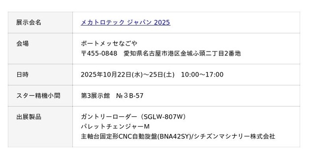 2025年10月22日(水)から25日(土)の4日間、ポートメッセなごや(愛知県名古屋市港区)で開催される日本最大級の工作機械見本市「メカトロテックジャパン 2025」へ出展する。
