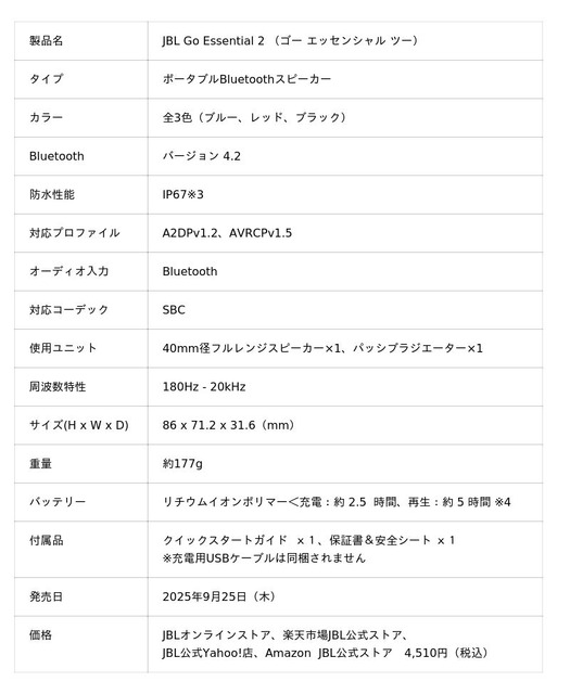 JBLオンラインストア:https://jp.jbl.com/GO-ESSENTIAL-2.html