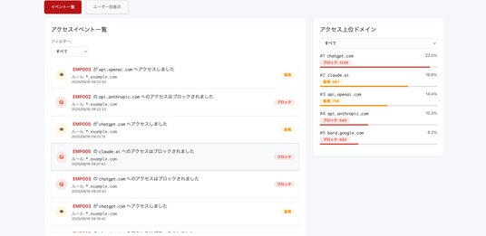 - 未承認AIのリアルタイム遮断ブラウザやアプリケーション経由で利用される生成AIを検知し、ドメイン単位でアクセスを制御。