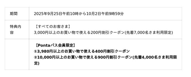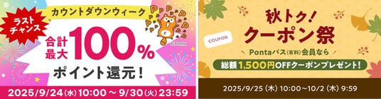 また、2025年9月25日から10月2日までの期間、「au PAY マーケット」においてすべてのお客さまに先着でご利用いただけるクーポンを配布する「秋トク!クーポン祭」を開催します。さらにPontaパス会員なら、2種類のクーポンを追加でご利用いただけます。合計最大1,500円の割引クーポンで、さらにおトクにお買い物いただけます。