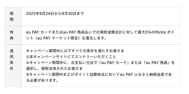 「au PAY ふるさと納税」ラストチャンス カウントダウンウィーク: https://furusato.wowma.jp/announce/campaign_250924/