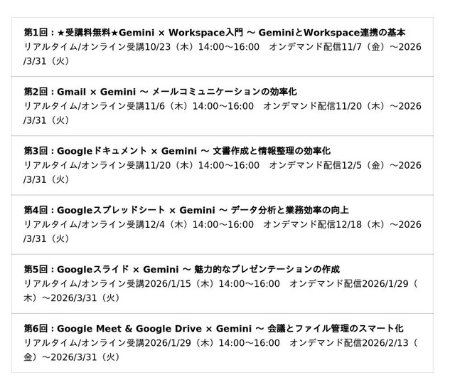 「Gemini × Google Workspace活用講座」は、Googleの最新生成AI「Gemini」と、「Google Workspace」を連携させて業務効率化を実現する実践的なスキルを学べる講座です。全6回の講座のうち、第1回講座「Gemini × Workspace入門 ~ GeminiとWorkspace連携の基本」は受講料無料。すべての講座を、Zoomによるリアルタイムでの「オンライン受講」と時間と場所を選ばない「オンデマンド配信」のどちらでも受講可能です。