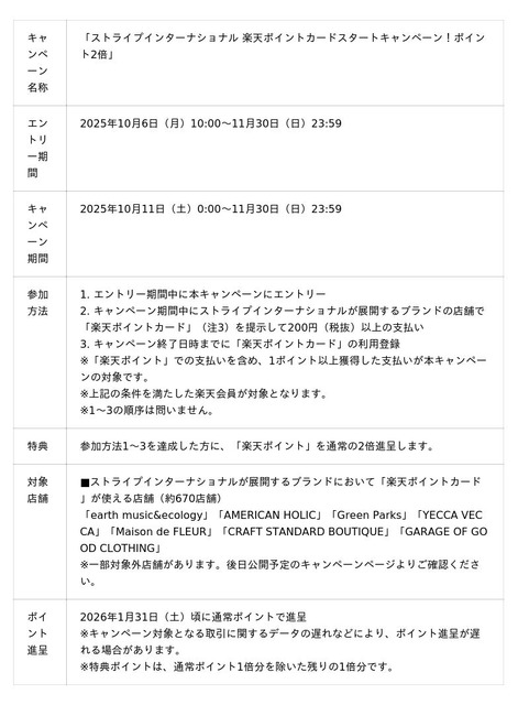 本導入を記念して、2025年10月11日(土)から11月30日(日)まで、「ストライプインターナショナル 楽天ポイントカードスタートキャンペーン!ポイント2倍」を実施します。