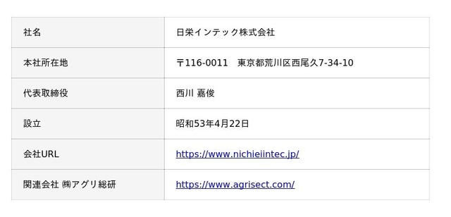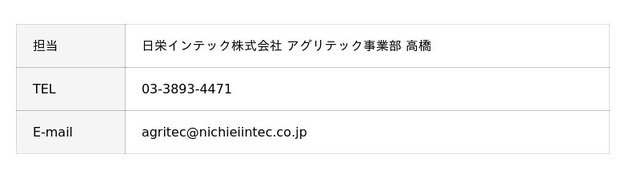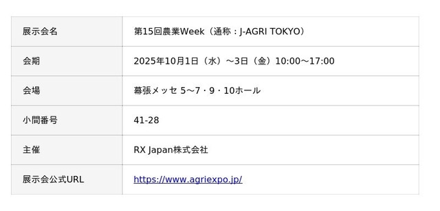 日栄インテック株式会社(本社:東京都荒川区、代表取締役社長:西川 嘉俊、以下 日栄インテック)は、2025年10月1日(水)から10月3日(金)まで幕張メッセで開催される「第15回農業Week」に出展いたします。