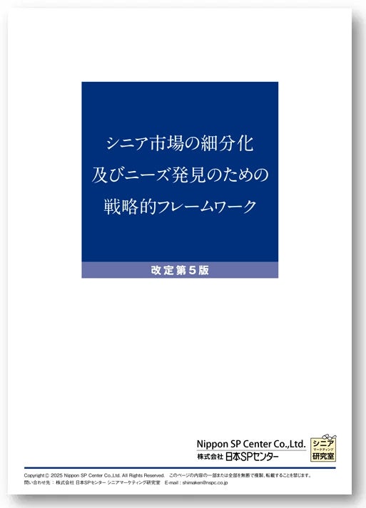 株式会社日本SPセンター(本社:東京都渋谷区/社長:渡邉一男)の シニアマーケティング研究室は、whitepaper「シニア市場の細分化及びニーズ発見のためのフレームワーク」を最新データで更新した、改訂第5版をリリースしました。
