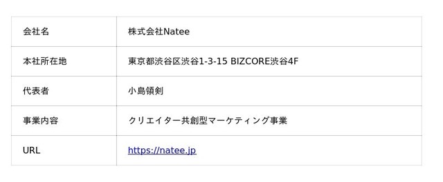 Nateeは「人類をタレントに。」をミッションに掲げ、個人をエンパワーメントし産業構造の変化を起こす事業を創造する会社です。SNSに特化したクリエイター共創型マーケティング事業では、ブランドとクリエイターの世界観をかけ合わせた「共創型」のプロモーション施策を提供しています。
