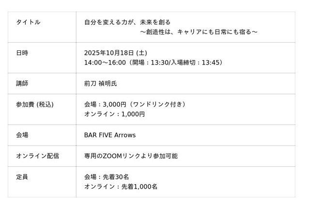 仕事にも日常にも応用できる発想力・行動力を、ぜひこのセッションでご体感ください。変化の時代をしなやかに生きるための、新しい思考のスイッチ「Creative Desire」がきっと見つかります。