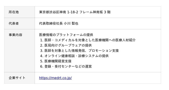 本提携により、医師をはじめとする約20 万人以上の医療従事者会員を有するMRT のネットワークと、当社の産業医紹 介サービスも含めた産業保健支援サービスを組み合わせることで、全国各地において迅速かつ適切な産業医確保を実現で きる体制を構築いたします。