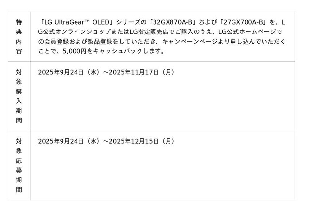 キャンペーンページ:https://www.lg.com/jp/promotion/pc-monitor/2025/cashback/
