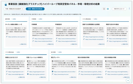 製造業やR&D部門において、新たなアイデアを得ても、その実現可能性を検討するための外部環境調査には膨大な時間がかかるという課題がありました。