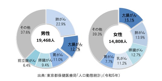 都民のがんによる死亡原因のうち、大腸がんは、男性が第2位、女性が第1位(※1)と上位を占めます。40歳過ぎから罹患率が増加しますが、早期発見・早期治療での5年後生存率は90%以上です(※2)。