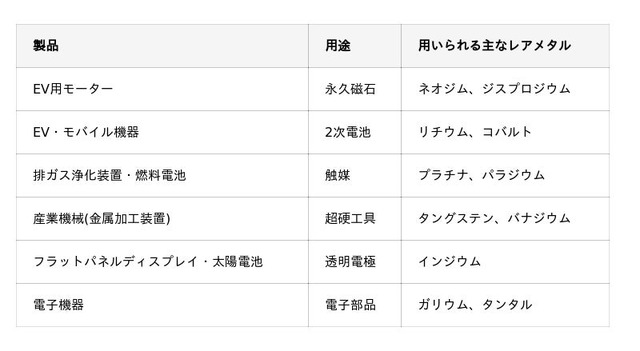 レアメタルが用いられる主な製品・用途としては次のようなものが挙げられます。この表で示したレアメタルはすべて前述した日米欧政府の定義に共通して含まれる元素となっています。