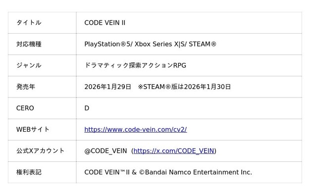 株式会社バンダイナムコエンターテインメントは、ドラマティック探索アクションRPGの新作『CODE VEIN II』について、 PlayStation(R)5/Xbox Series X|Sにて2026年1月29日に、STEAM(R)にて1月30日に発売が決定いたしました。また、本日より順次予約開始したことをお知らせいたします。