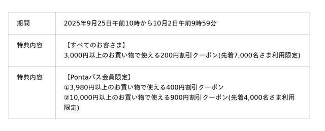 期間中は、2025年9月25日から26日にかけて開催される「お買い物ラリー」での最大34%ポイント還元や、9月28日から29日にかけて「サンキュー配送」対象商品をご購入いただいた際の5%ポイント還元も実施します。クーポンと合わせてご利用いただくことで、さらにおトクにお買い物をお楽しみいただけます。
