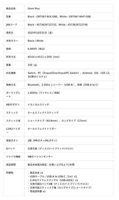この度、毎日の当たり前をアップデートする『GRAPHT STANDARD』シリーズより、スティック・十字キーの交換、背面ボタンの割り当てによるクイックカスタム可能なゲームパッド『Omni Plus(読み:オムニ プラス、Black / White)』をGRAPHT公式ECサイト『GRAPHT OFFICIAL STORE』(以下 ECサイト)や全国の家電量販店等にて2025年10月31日(金)に発売します。