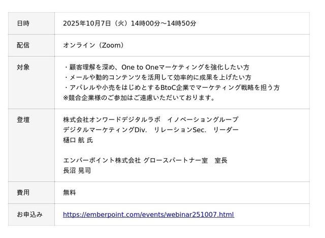 エンバーポイント株式会社(本社:東京都千代田区、代表取締役:五十嵐 真人)は、株式会社オンワードデジタルラボ(本社:東京都港区、代表取締役社長:山下 哲)をゲストにお招きし、2025年10月7日(火)14時00分より、パーソナライズマーケティングの成功事例を解説する無料オンラインセミナーを開催します。