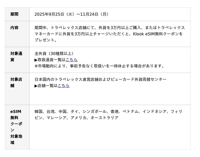 トラベレックスジャパン株式会社(本社:東京都港区、代表取締役:大谷淳)は、 Klook Travel Technology Limited(本社:香港、共同創業者兼CEO:イーサン・リン)と共同で、2025年9月25日(木)から11月24日(月)の期間、「秋のeSIM無料キャンペーン」を実施いたします。本キャンペーンでは、国内トラベレックス店舗で外貨両替をいただだいたお客さまに、Klook eSIM無料クーポンをプレゼントいたします。