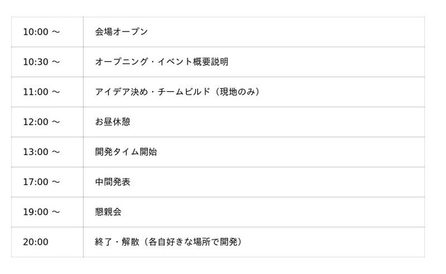 現地会場持ち物:開発に必要な機材(PC/スマホ等)。会場無線LAN・電源タップあり。